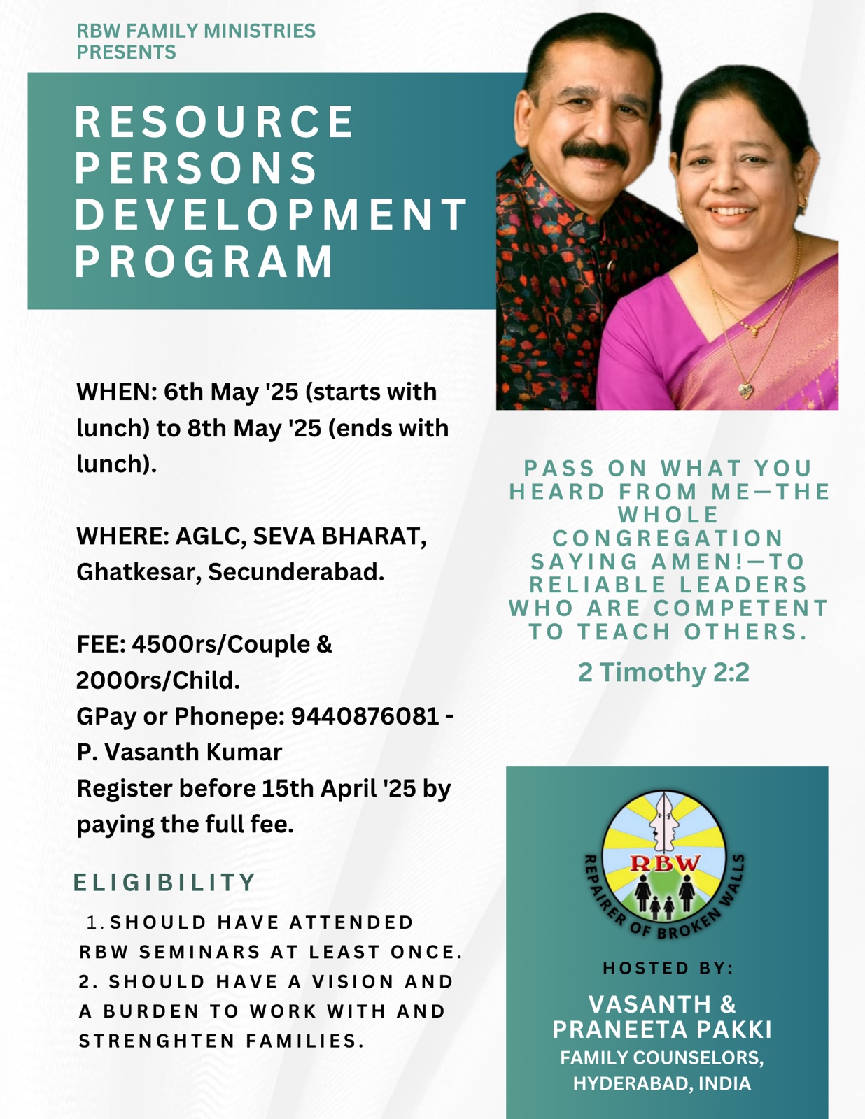 RBW Family Ministries is committed to building and rebuilding strong Christ-centered homes, and equipping the church and society with a solid Biblical foundation for Christian marriages and homes.